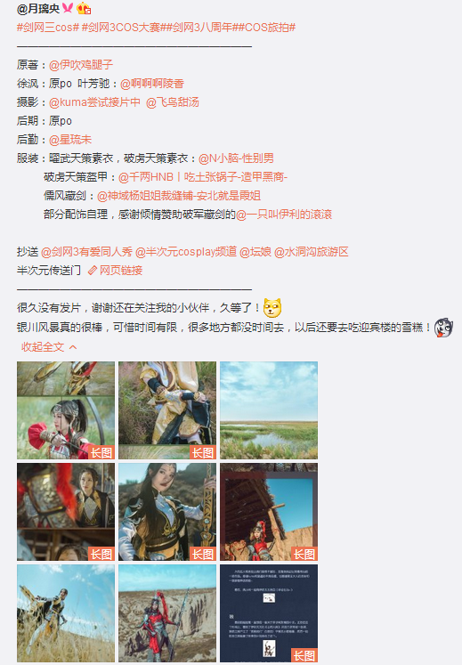 感谢跋山涉水辛苦拍摄的COSER为我们带来这样精彩的作品,水洞沟文化遗址风光能够让玩家们体会到游戏的意境,通过逼真的人物感受到这些角色的魅力,让我们也能与有荣焉!也欢迎可爱的剑网3玩家们来水洞沟旅游哟!