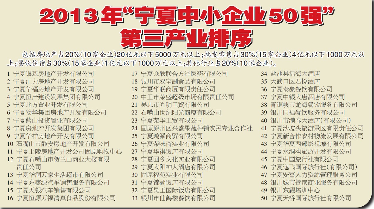 2013年“宁夏中小企业50强”第三产业排序