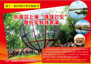由自治区旅游局主办的第十一届中国宁夏(银川)国际汽车摩托车自驾旅游节将于7月25日至30日在银川市举办,在水洞沟能看到精彩刺激的“环球飞车”摩托车特技表演,每天4场10:30、11:30、15:30、16:30精彩呈现。