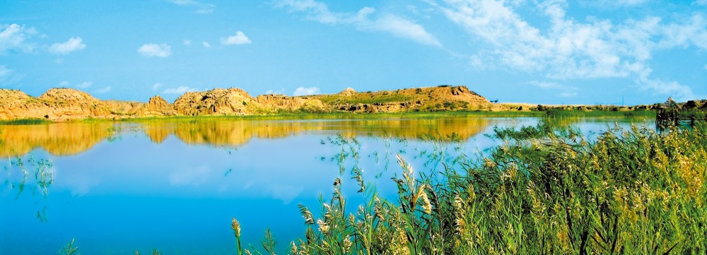 这座湖,有一个美丽的名称,叫鸳鸯湖。水面近10万平方米,水深3至4米,是水洞沟常年涓涓不断的细流,挟带着地表的盐分,汇集而成的一个咸水湖,不过水中盐分并不太高。来到这里,我们置身于大漠深处的湖光山色之中,粗犷的大漠,横亘的远峰,巍峨的长城,波光粼粼的湖水,构成了宁静,柔和,统一的和谐之美。在这里,我们深切体味到的是“大漠孤烟直,长河落日圆”的雄浑气魄和“平湖如镜水清涵,山翠天光荡蔚兰”的塞上江南风情。每当春夏之交,常有多种水鸟在湖面上游弋,见到最多的是成对成双的鸳鸯,因此人们把这个湖称作“鸳鸯湖”。近年来,湖面上又多见雪白的天鹅,更为鸳鸯湖增添了一大胜景。