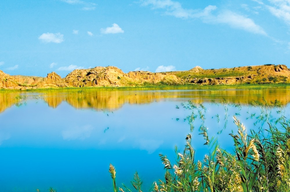 这座湖,有一个美丽的名称,叫鸳鸯湖。水面近10万平方米,水深3至4米,是水洞沟常年涓涓不断的细流,挟带着地表的盐分,汇集而成的一个咸水湖,不过水中盐分并不太高。来到这里,我们置身于大漠深处的湖光山色之中,粗犷的大漠,横亘的远峰,巍峨的长城,波光粼粼的湖水,构成了宁静,柔和,统一的和谐之美。在这里,我们深切体味到的是“大漠孤烟直,长河落日圆”的雄浑气魄和“平湖如镜水清涵,山翠天光荡蔚兰”的塞上江南风情。每当春夏之交,常有多种水鸟在湖面上游弋,见到最多的是成对成双的鸳鸯,因此人们把这个湖称作“鸳鸯湖”。近年来,湖面上又多见雪白的天鹅,更为鸳鸯湖增添了一大胜景。