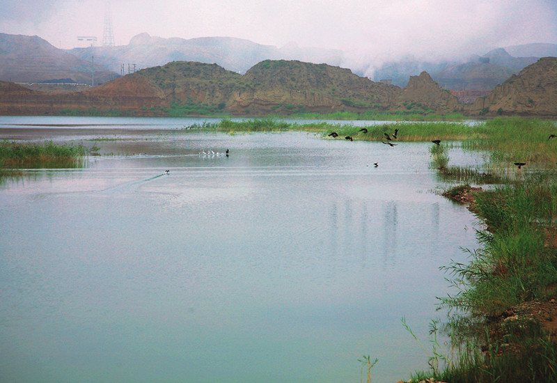 这座湖,有一个美丽的名称,叫鸳鸯湖。水面近10万平方米,水深3至4米,是水洞沟常年涓涓不断的细流,挟带着地表的盐分,汇集而成的一个咸水湖,不过水中盐分并不太高。来到这里,我们置身于大漠深处的湖光山色之中,粗犷的大漠,横亘的远峰,巍峨的长城,波光粼粼的湖水,构成了宁静,柔和,统一的和谐之美。在这里,我们深切体味到的是“大漠孤烟直,长河落日圆”的雄浑气魄和“平湖如镜水清涵,山翠天光荡蔚兰”的塞上江南风情。每当春夏之交,常有多种水鸟在湖面上游弋,见到最多的是成对成双的鸳鸯,因此人们把这个湖称作“鸳鸯湖”。近年来,湖面上又多见雪白的天鹅,更为鸳鸯湖增添了一大胜景。